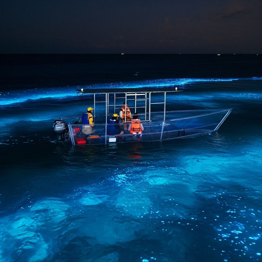 We will navigate gently through the area, and the boat's own movement will create mesmerizing ripples of light. You'll see the plankton ignite and watch the glowing trails of fish, all right through the clear floor beneath your feet.